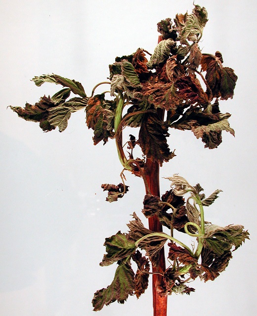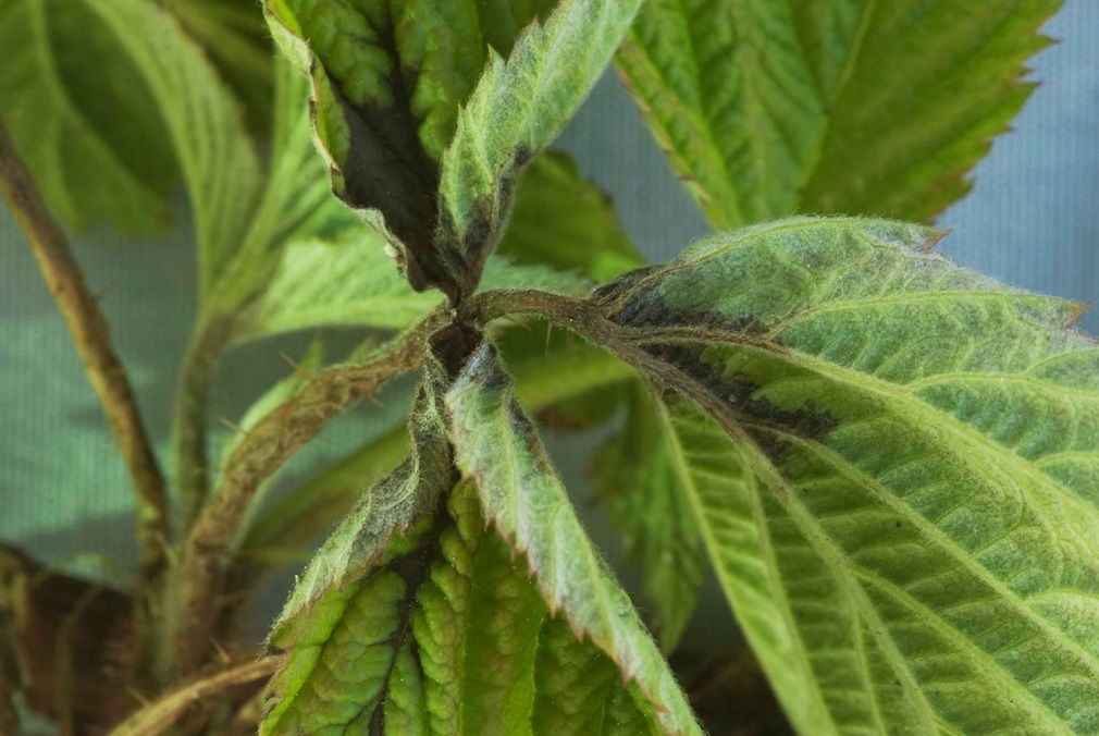 Pege se šire i dobijaju zagasito mrku boju, i takve se proširuju na vaskularni sistem. Svi izdanci žbuna mogu da se zaraze i propadnu.