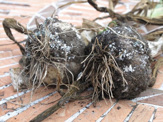 Glavice belog luka koje obole tokom čuvanja su bez vidljivih simptoma oboljenja. Tek na pritisak prstom oseća se da su čenovi meki. Kad se sa ovakvih glavica skinu ovojni listići ispod njih se jasno uočava beličasta prevlaka sa sklerocijama. Obolele lukovice se ne raspadaju već vremenom očvrsnu i munificiraju se.