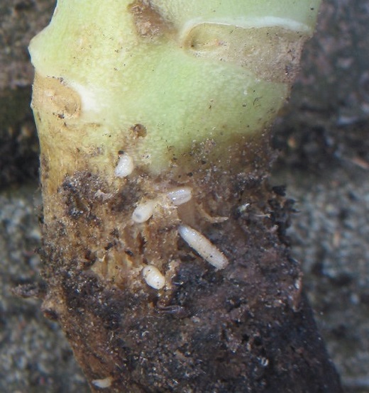 Na osnovu dugogodišnjeg iskustva, suzbijanje prisutnih larvi se može raditi primenom insekticida kroz sistem za navodnjavanje korišćenjem insekticida na bazi aktivne materije tiametoksam ili insekticida na bazi aktivnih materija hlorpirifosa i piretroida u koncentraciji 0,15%, u količini od 50-100 mililitara rastvora po biljci. Nakon aplikacije insekticida, svakoj biljci je potrebno dodati još i istu količinu čiste vode kako bi se insekticid spustio u zonu korena gajenih biljaka.
