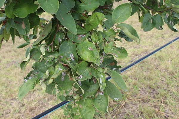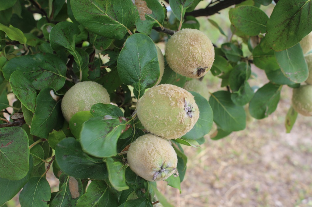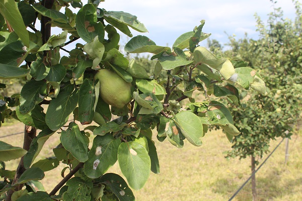 Na području delovanja RC Subotica zasadi dunje se nalaze u fazi od plodovi oko polovine krajnje veličine do faze plodovi oko 70% krajnje veličine (BBCH 75 – 77). Vizuelnim pregledom zasada uočeno je prisustvo simptoma na listovima od ishrane larvi minera belih mina (Lithocolletis corylifoliella).