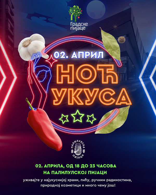 Javno komunalno preduzeće „Gradske pijace” organizuje u subotu, 2. aprila, treću gastronomsku manifestaciju „Noć ukusa” u modernom prostoru Palilulske pijace.