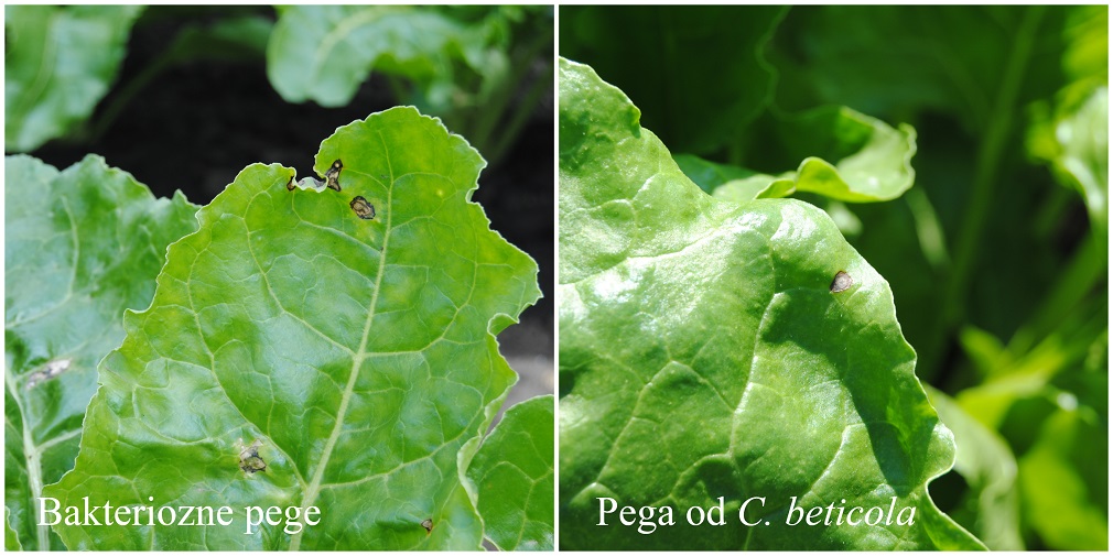 Napomena: Prilikom pregleda useva, pege od cerkospore trebalo bi tražiti na starijem, potpuno razvijenom lišću. One su sitne, okruglaste i oivičene zonom mrke boje. Međutim, trebalo bi uzeti u obzir da su u usevima šećerne repe prisutni i simptomi bakterioza koji mogu otežati identifikaciju pega od cerkospore, zato pogledajte fotografiju ispod na kojoj su prikazane razlike prisutnih pega u usevima šećerne repe.