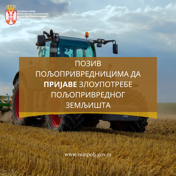 Svi poljoprivredni proizvođači koji imaju informacije o zloupotrebama u vezi sa prijavom poljoprivrednog zemljišta pozivaju se da od danas pošalju svoje informacije o zloupotrebama na elektronsku adresu prijavizloupotrebu@minpolj.gov.rs.