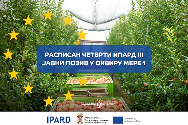 Ministarstvo poljoprivrede, šumarstva i vodoprivrede (Uprava za agrarna plaćanja) raspisalo je Četvrti javni poziv za podnošenje zahteva za odobravanje projekta za IPARD podsticaje za investicije u fizičku imovinu poljoprivrednih gazdinstava u sektoru voća za podizanje višegodišnjih proizvodnih i matičnih zasada voća, kao i nabavku nove opreme za višegodišnje proizvodne i matične zasade voća u okviru IPARD III programa.