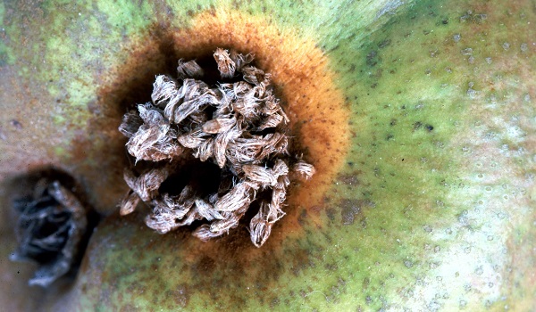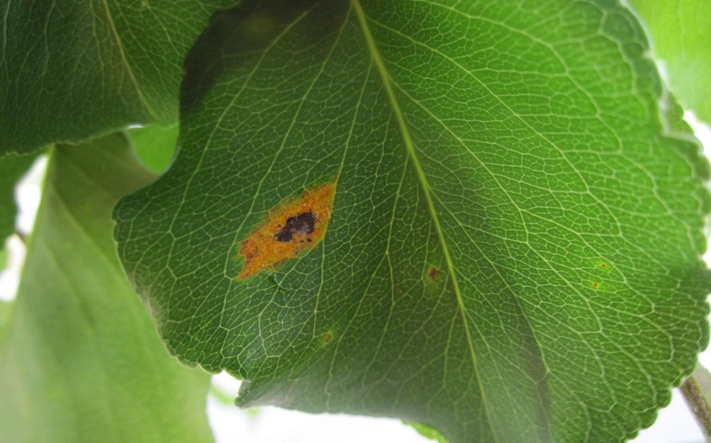 Prvi simptomi se vide u proleće na licu listova u vidu nepravilnih žutih do narandžastih pega. Vremenom one se povećavaju i mogu zahvatiti veći deo listova, kada dolazi do defolijacije. Na naličju, krajem leta, u okviru pega se formiraju ecidije koje su rogljastog oblika i izdižu se sa površine lista do visine od 5 mm. Pege se javljaju i na izdancima, granama i plodovima. Na mladim izdabncima mogu prouzrokovati rak rane ili izazvati mumificiranje plodova koji otpadaju.