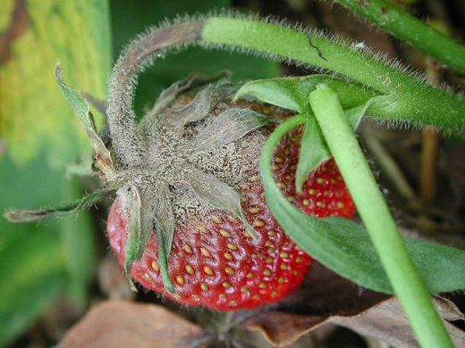 Gljivica Botrytis cinerea karakteristična je po tome što na napadnutim jagodama stvara sivu masu plesni na plodovima.