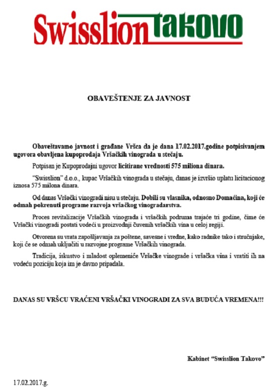 ’Swisslion’ uplatio 575 miliona dinara za ’Vršačke vinograde’