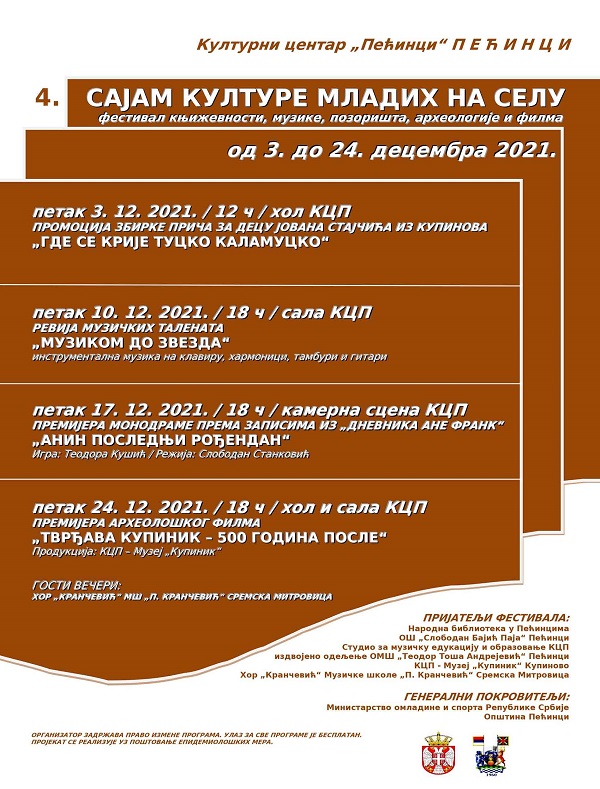 Sajam kulture mladih na selu, koji se ove godine realizuje četvrti put u organizaciji pećinačkog Kulturnog centra pod pokroviteljstvom Ministarstva kulture i informisanja Republike Srbije i Opštine Pećinci, biće održan od 3. do 24. decembra.