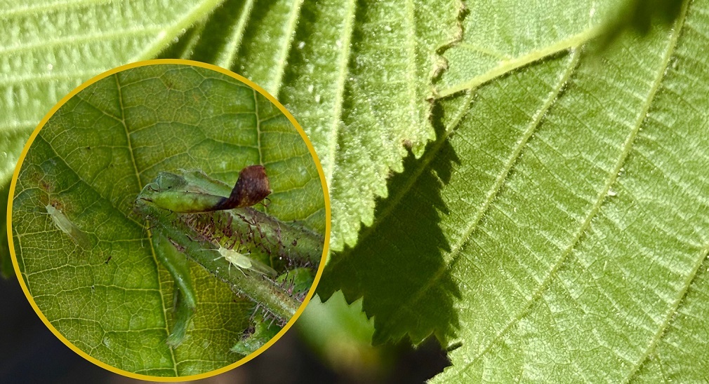 Tokom vizuelnih pregleda zasada leske na naličju listova uočeno je prisustvo lisne vaši leske (Myzocallis corylii).