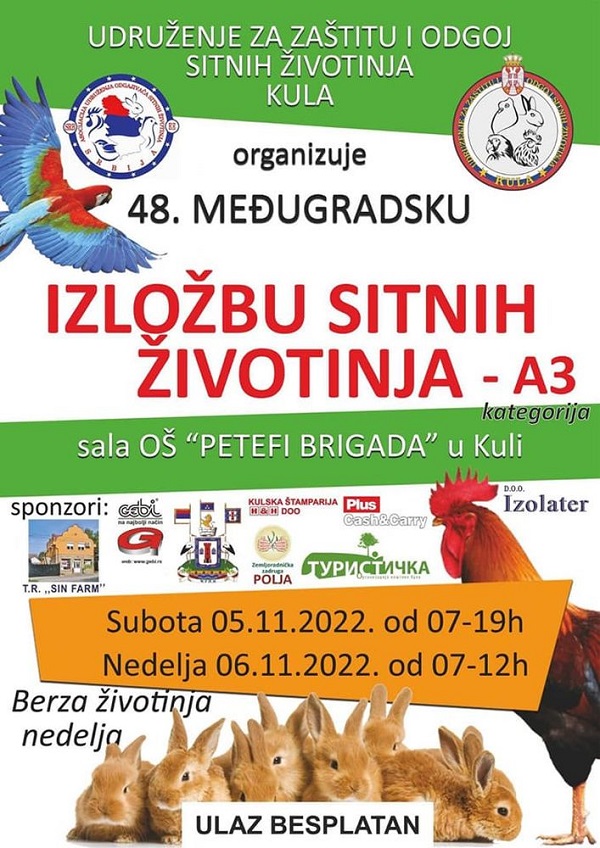 U Kuli će 48. biti održana međugradska izložba sitnih životinja, a zbog velikog interesovanja organizator je odlučio da se izložba ove godine održi u hali OŠ „Petefi brigada“ kako bi svi ljubitelji sitnih životinja mogli da uživaju u puno većem prostoru.